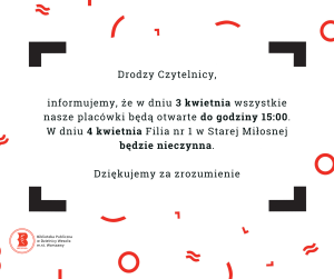 Okres świąteczny 27/03/2026 Drodzy Czytelnicy, informujemy, że w dniu 3 kwietnia (Wielki Piątek) wszystkie nasze placówki będą otwarte do godziny 15:00. W dniu 4 kwietnia (Wielka Sobota) Filia Czytaj więcej »